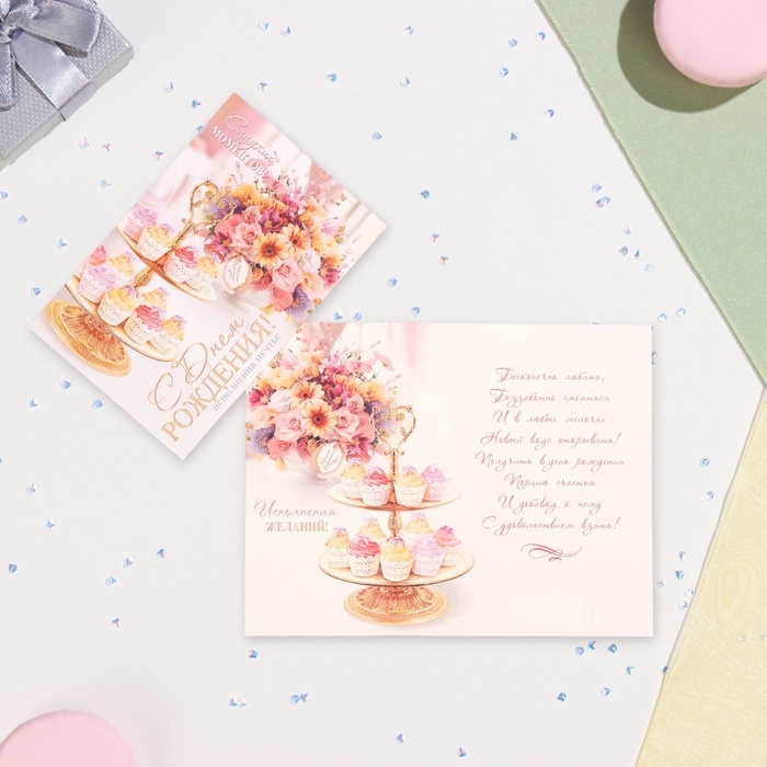 Открытка "С Днём Рождения!" глиттер, конгрев, пирожные, 12,5 х 19,4 см