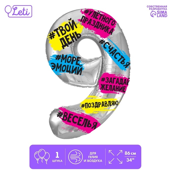 Шар фольгированный 34" "Цифра 9", хештеги