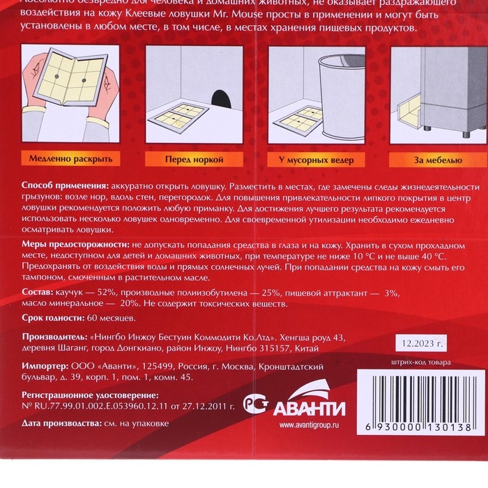 Ловушки Mr. Mouse просты в применении и могут быть установлены где угодно, в том числе и в местах хранения пищевых продуктов. Средство содержит 40 г клея.