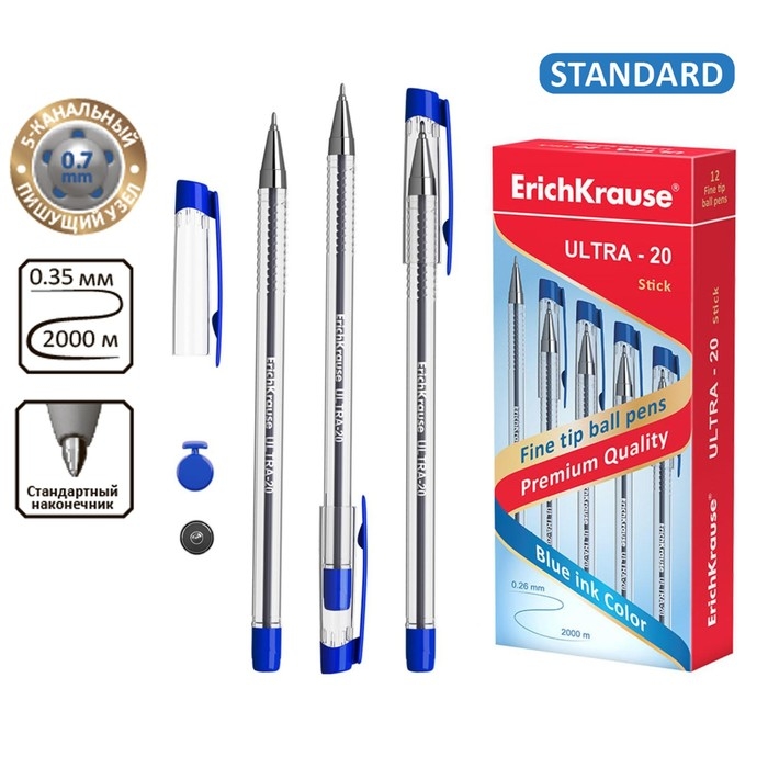 Ручка шариковая ErichKrause ULTRA-20, игольчатый узел 0.7 мм, чернила синие, супермягкое письмо, длина линии письма 2000 метров