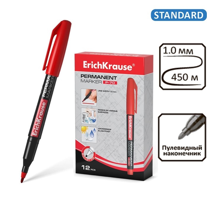 Маркер перманентный 1.0 мм ErichKrause P-70 красный, чернила на спиртовой основе светостойкие, водостойкие. Для письма на любой поверхности