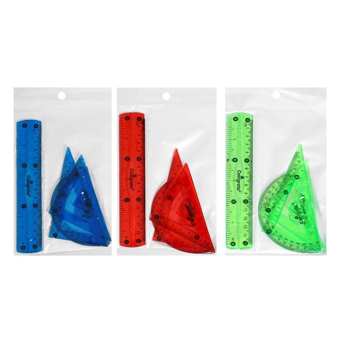 В комплекте: линейка 15 см, 2 треугольника, транспортир.