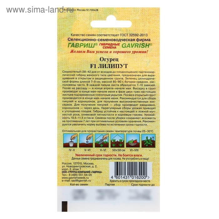 Семена Огурец "Лилипут" F1, пикуль, скороспелый, партенокарпический, 10 шт.