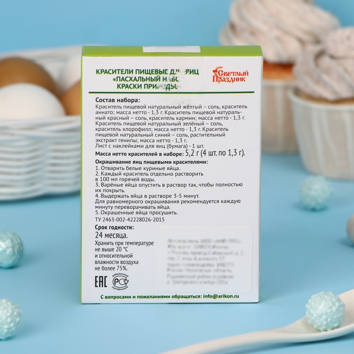 Краситель пищевой натуральный жёлтый – соль, краситель аннато; масса нетто - 1,3 г. Краситель пищевой натуральный красный – соль, краситель кармин; масса нетто - 1,3 г. Краситель пищевой натуральный зелёный – соль, краситель хлорофилл; масса нетто - 1,3 г. Краситель пищевой натуральный синий – соль, растительный экстракт генипы; масса нетто - 1,3 г. Лист с наклейками для яиц (бумага) - 1 шт.
