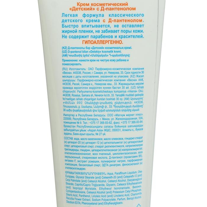 Детский крем “Весна” с Д-пантенолом - это нежный крем, специально разработанный для ухода за чувствительной кожей детей. Крем содержит Д-пантенол, который увлажняет и смягчает кожу, а также помогает восстановить ее естественный барьер. Крем легко наносится и быстро впитывается, не оставляя жирной пленки. Он идеально подходит для ухода за кожей после купания, а также для предотвращения раздражения и сухости. Д-пантенол помогает устранить покраснения кожи и опрелости. Детский крем Д-пантенол отлично справляется с раздражением и покраснениями, заживляет трещинки и предотвращает их появление. Детский крем быстро впитывается не оставляет жирной пленки,не забивает поры кожи не содержит парабенов и красителей хорошо увлажняет кожу.