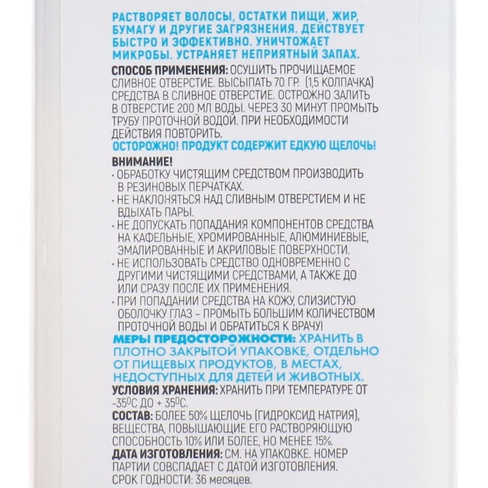 Меры предосторожности: осторожно. Содержит едкую щелочь. Использовать резиновые перчатки. Не наклонятся над сливным отверстием и не вдыхать пары. Не допускать попадания компонентов средства на кафельные, хромированные, алюминиевые, эмалированные и акриловые поверхности. Не использовать средство одновременно с другими чистящими средствами. При попадании средства на кожу, слизистую оболочку глаз – промыть большим количеством воды и обратиться к врачу. Хранить при температуре от -35 до +35С.
