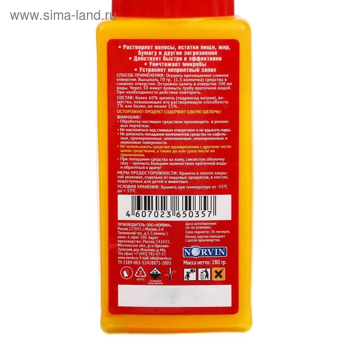 Сверх мощное средство. Для растворения загрязнений в канализационных трубах и устранения неприятных запахов в трубах ванн и раковин. Растворяет волосы, остатки пищи, жир, бумагу и другие загрязнения. Действует быстро и эффективно, уничтожает микробы.
