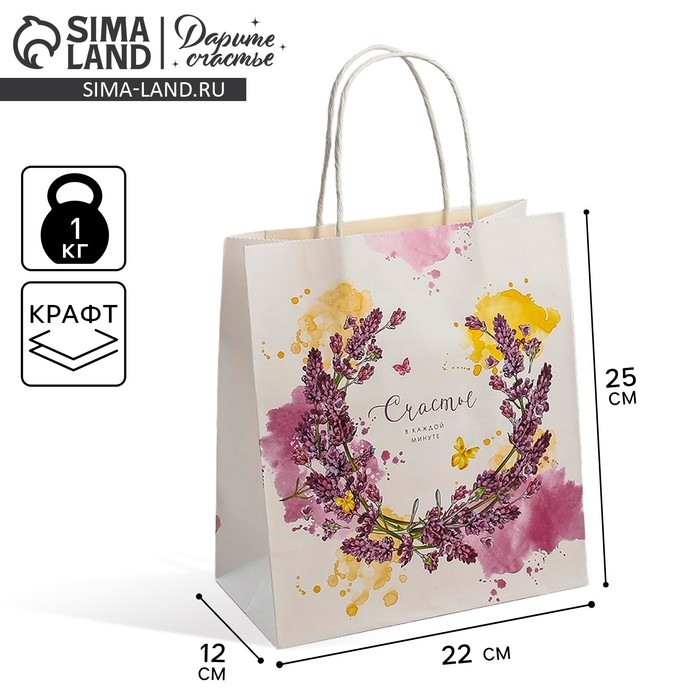Пакет подарочный крафт, упаковка, «Счастье в каждой минуте», 22 х 25 х 12 см