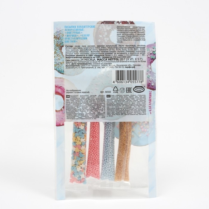 Область применения: декоративные кондитерские посыпки наносят на поверхность готовых изделий (тортов, пирожных, кексов, рулетов, мороженого, шоколадной глазури, сахарной помадки, сдобы и бубликов и других) для придания им красивого внешнего вида.