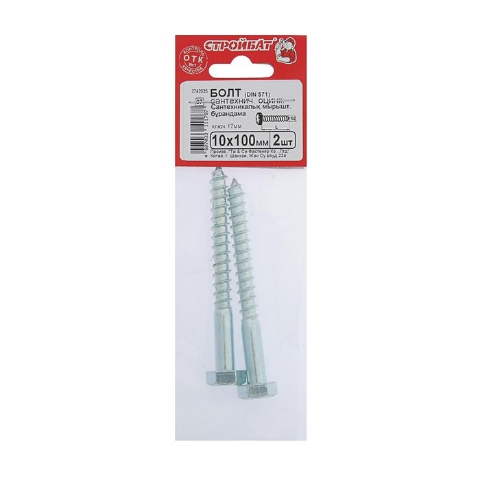 Шуруп-болт СТРОЙБАТ, сантехнический, оцинкованный, DIN 571, М10х100 мм, 2 шт