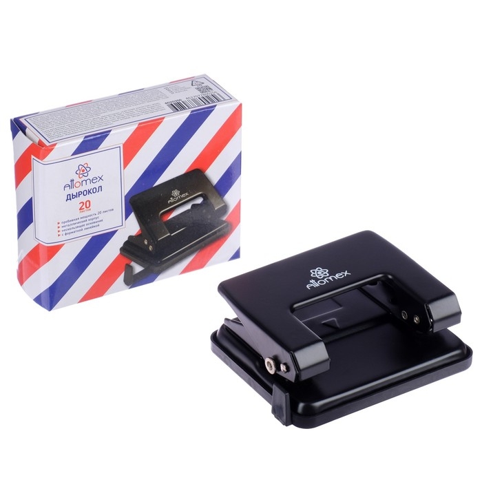 Дырокол "Attomex" (20 листов) металлический, с линейкой, в картонной коробке, черный.