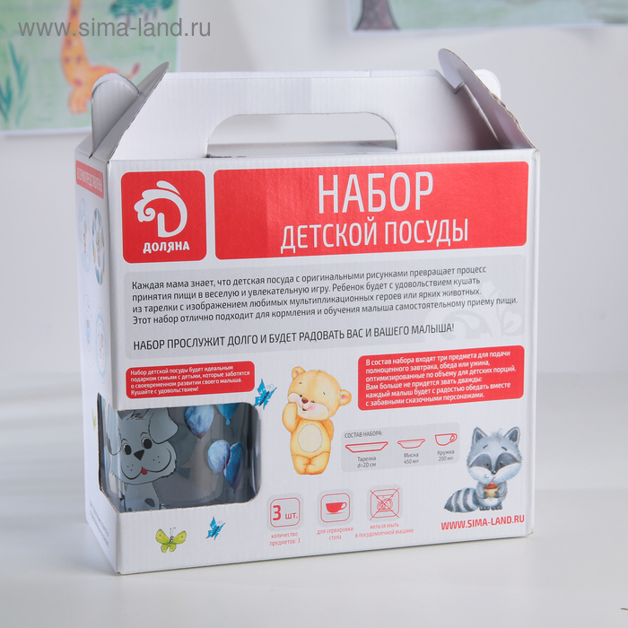 Набор детской посуды Доляна «Динозаврик» состоит из трёх предметов: миски, тарелки и кружки. Посуда изготовлена из прочного стекла, поэтому можно наливать горячее, использовать в СВЧ. Изделия имеют красивый рисунок детской тематики, а значит обязательно понравятся Вашему малышу. Кружка с удобной ручкой, её комфортно держать ребёнку.