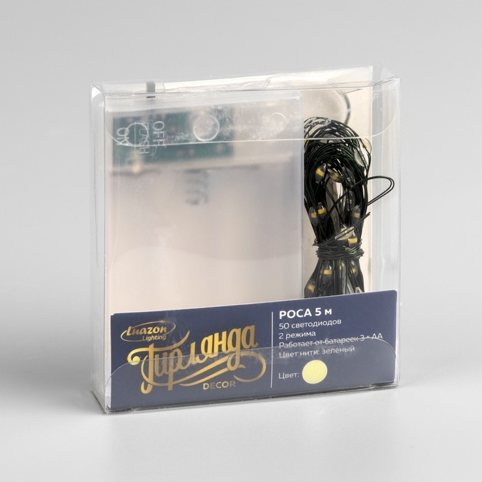 Гирлянда «Нить» 5 м роса, IP20, зелёная нить, 50 LED, 2 режима, батарейки AAх3 (нет в комплекте), свечение тёплое белое