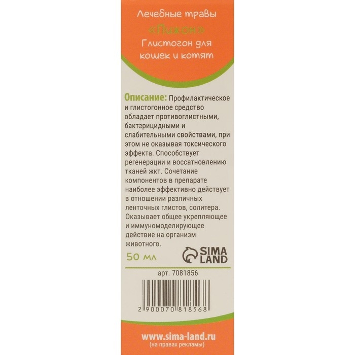 Лечебные травы "Пижон" глистогон, для кошек, 50 мл