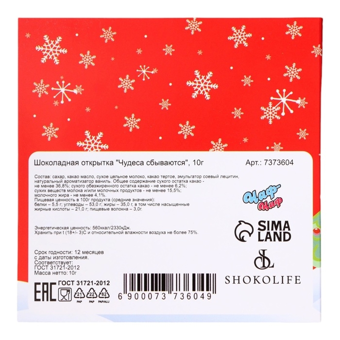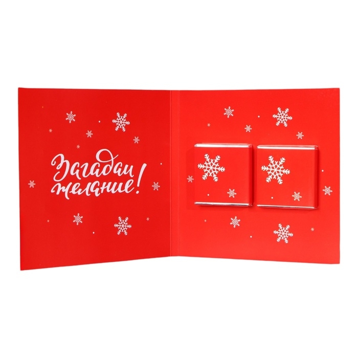 Шоколадная открытка – необычный и оригинальный способ поздравить с Новым годом! В ассортименте представлены интересные, забавные пожелания на любой вкус. Внутри каждой открытки вы найдёте маленькую шоколадку из настоящего шоколада высокого качества от российских и бельгийских производителей. Благодаря качественному составу, ваш сюрприз будет не только красивым, но и действительно вкусным!