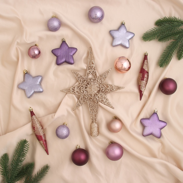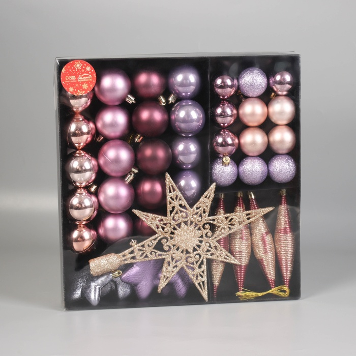 Набор украшений пластик с верхушкой 43 шт "Глория 1" (32 шара, 4 сосульки, 6 звёзд) микс