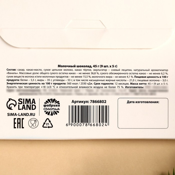 Состав: сахар, какао-масло, сухое цельное молоко, какао тёртое, эмульгатор – соевый лецитин, натуральный ароматизатор «Ваниль».
