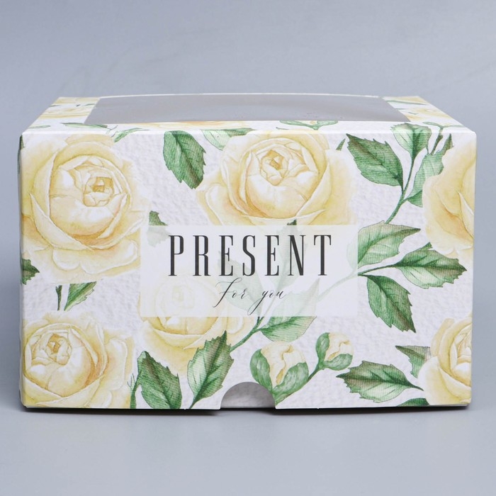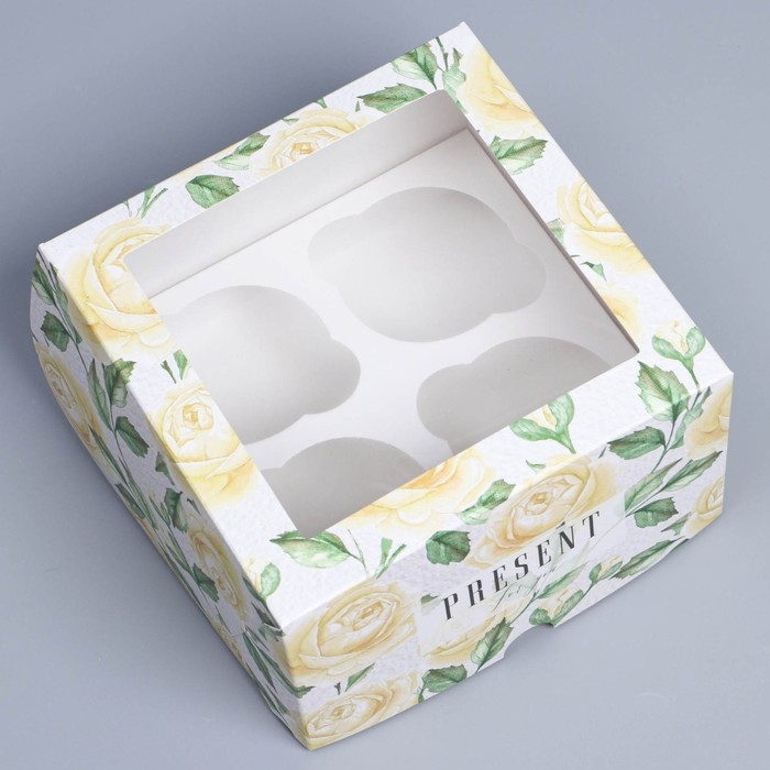 Коробка для капкейков, кондитерская упаковка с окном, 4 ячейки «Белые розы», 16 х 16 х 10 см