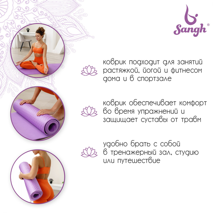 Коврик для йоги Sangh, 183×61×0,6 см, цвет сиреневый