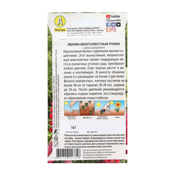 Семена Цветов Люпин "Рубин", 7 шт