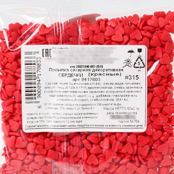 Посыпка фигурная «Сердца»: красная, 50 г.