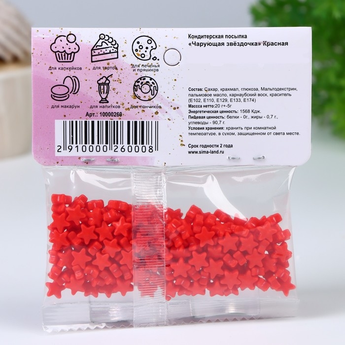 Кондитерская посыпка "Чарующая звёздочка" - это незаменимое украшение для Вашего праздничного стола. Даже самый простой в исполнении десерт заиграет яркими красками благодаря нашей кондитерской посыпке.