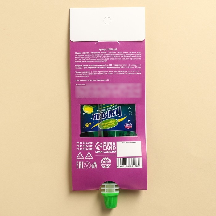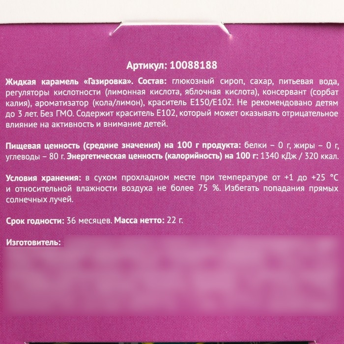 Состав: глюкозный сироп, сахар, питьевая вода, регуляторы кислотности (лимонная кислота, яблочная кислота), консервант (сорбат калия), ароматизатор (кола/лимон), краситель Е150/Е102.