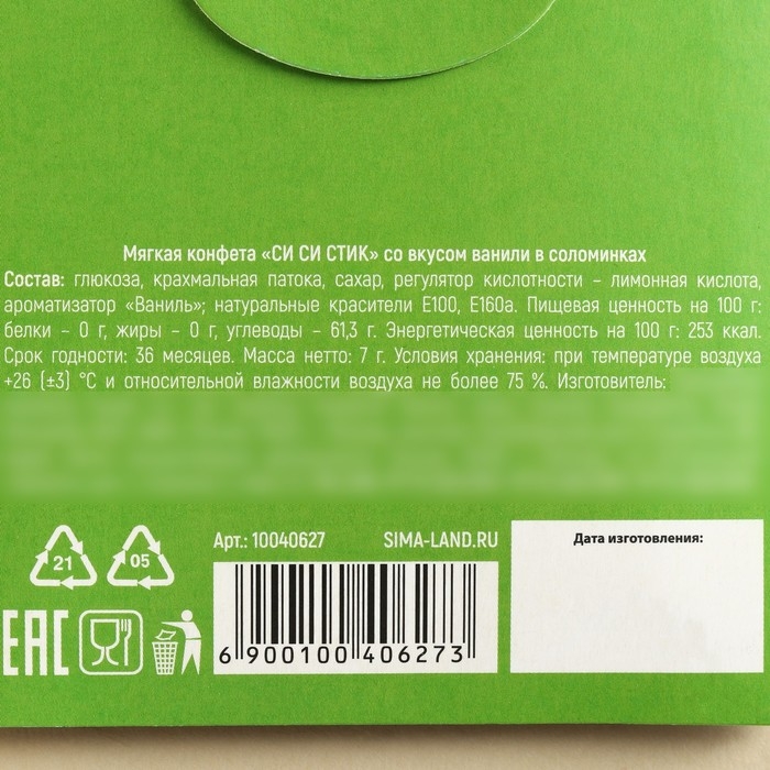Состав: глюкоза, крахмальная патока, сахар, регулятор кислотности - лимонная кислота, ароматизатор "Ваниль"; натуральные красители Е100, Е160а.