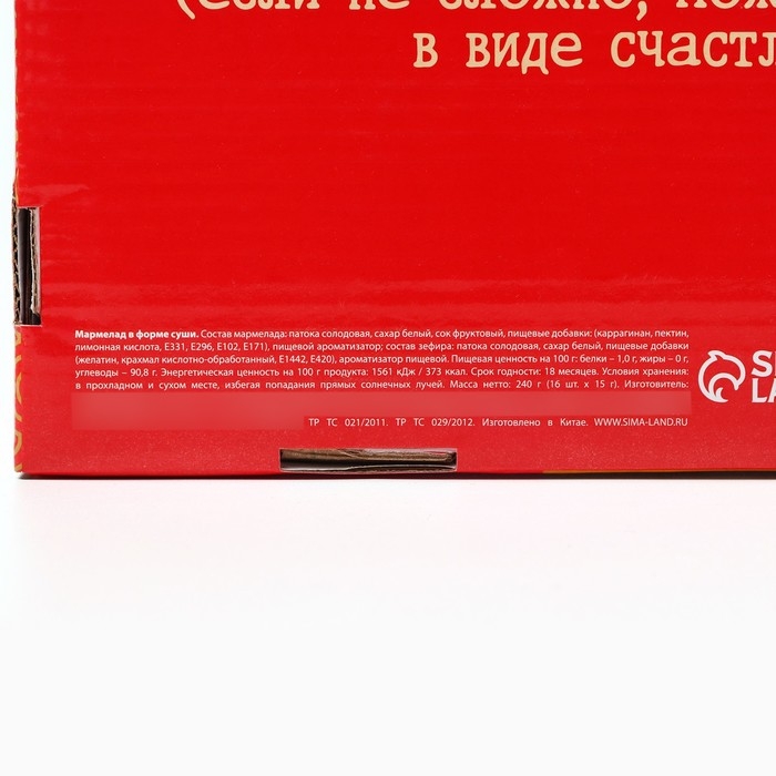 Состав: мармелад: патока солодовая, сахар белый, фруктовый, пищевые добавки: (каррагинан, пектин, лимонная кислота, Е331, Е296, Е102, Е171), пищевой ароматизатор; состав зефира: патока солодовая, сахар белый, пищевые добавки (желатин, крахмал кислотно- обработанный, Е1442, Е420), ароматизатор пищевой.