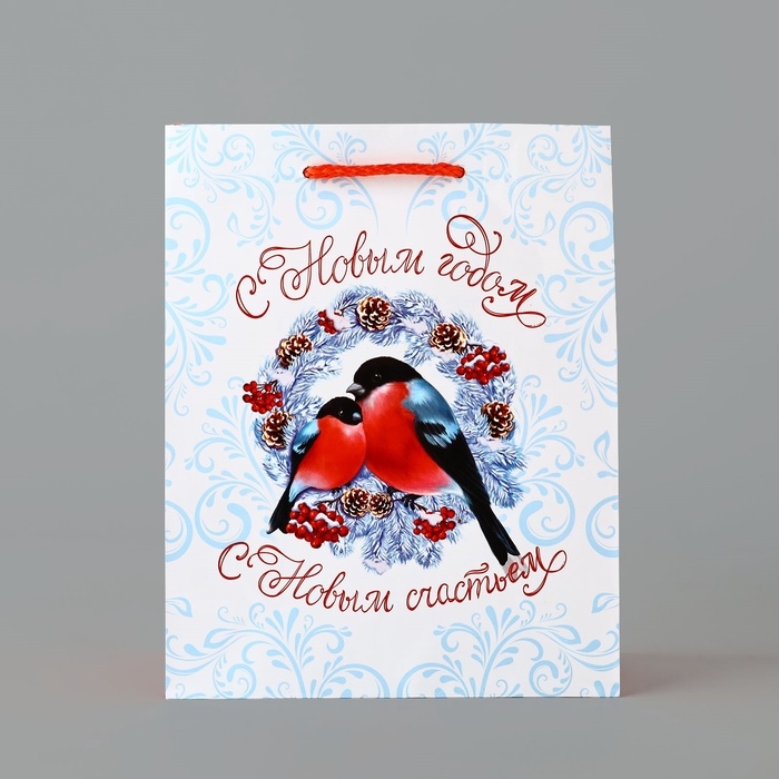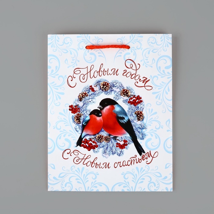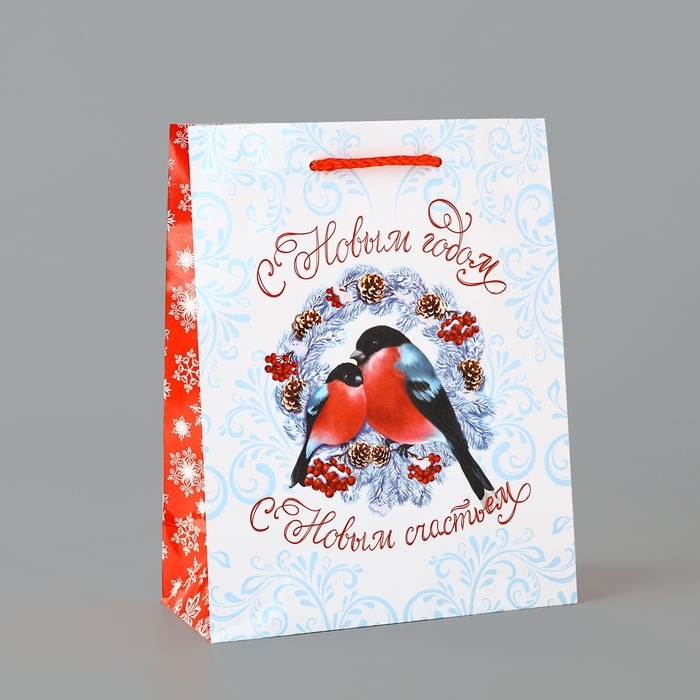 Пакет подарочный новогодний ламинированный «С Новым годом», снегири, MS 18 х 23 х 8 см, Новый год