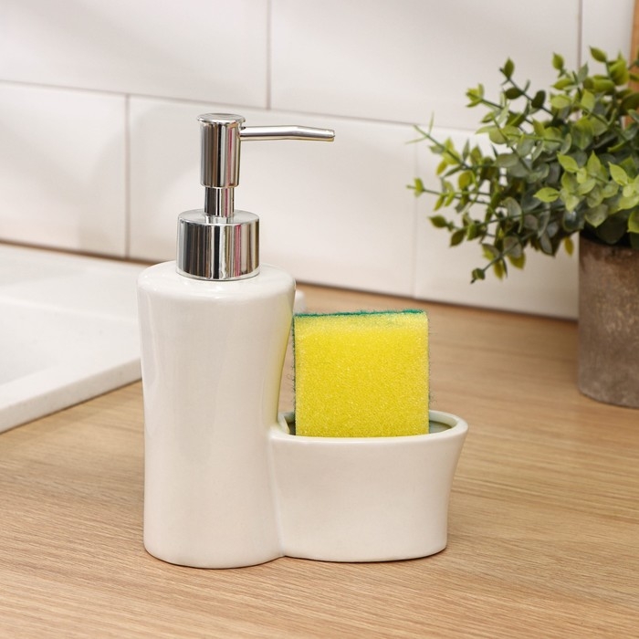 Дозатор для моющего средства с подставкой для губки Raccoon, 550 мл, губка в комплекте, цвет белый