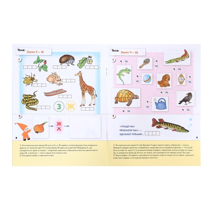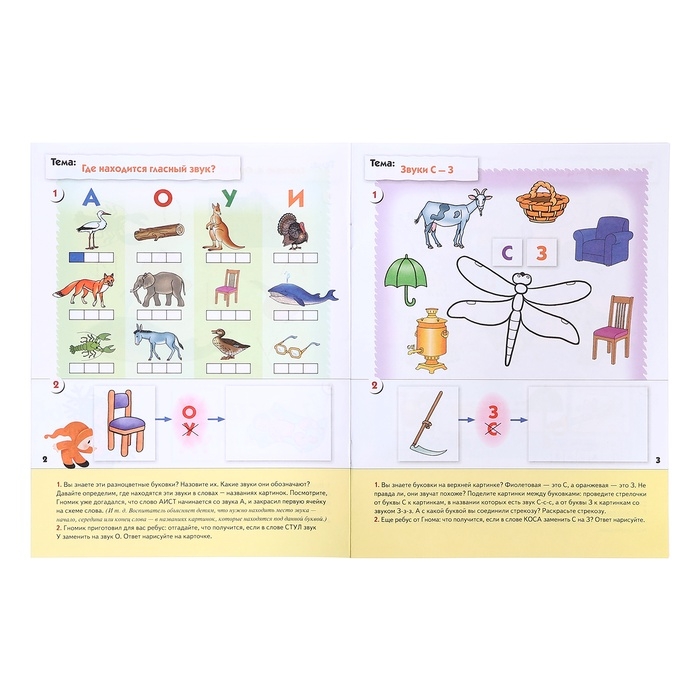 Выполняя задания из рабочей тетради, дошкольники повторяют уже знакомые им гласные звуки, учатся различать согласные, определять, с какого звука начинается слово, знакомятся с твёрдыми и мягкими звуками.