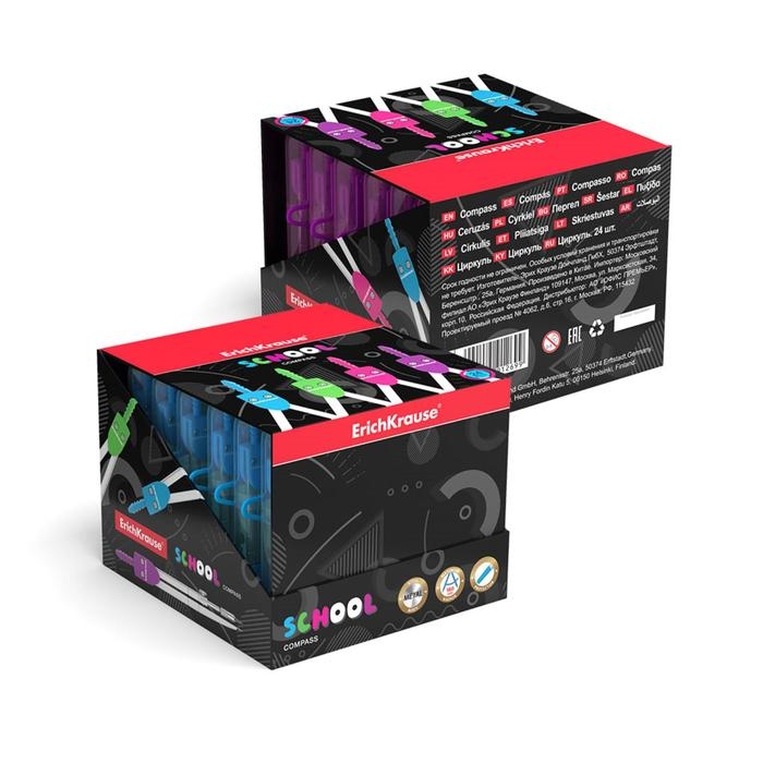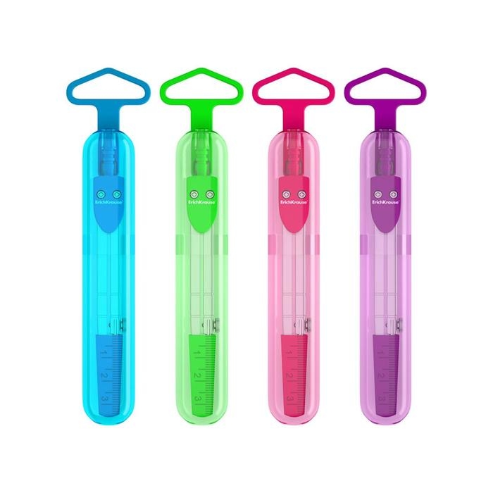 Металлический циркуль с максимальным радиусом 18см. Пластиковый чехол с линейкой обеспечивает защиту иглы и пишущего узла. Представлен в ярких неоновых цветах. Упакован в удобный пластиковый футляр с европодвесом.