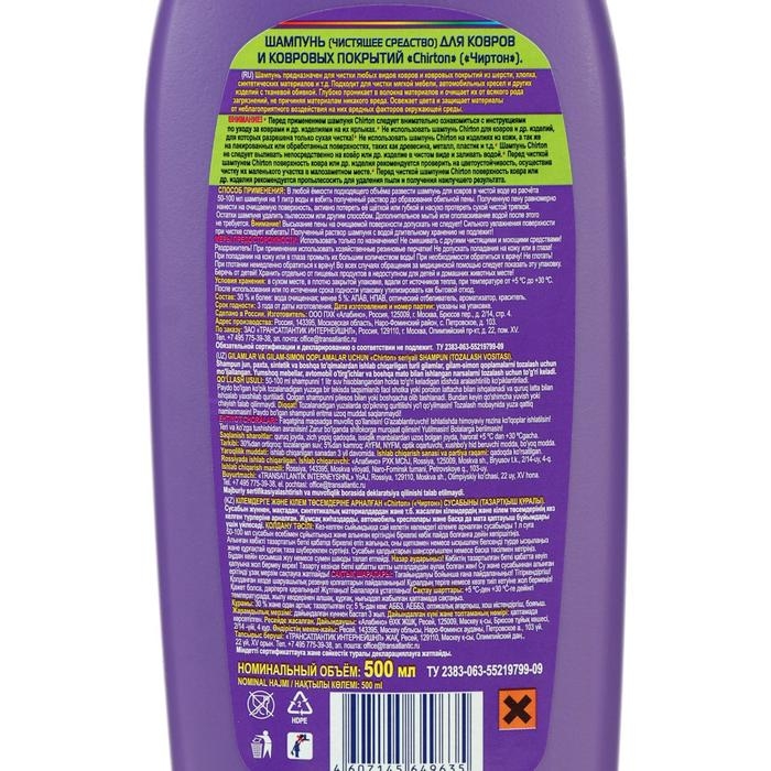 Шампунь для ковров и ковровых покрытий Chirton глубоко проникает в волокна тканей и очищает их, не причиняя вреда. Освежает цвета и защищает ткани.