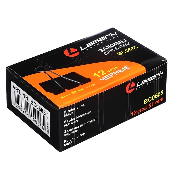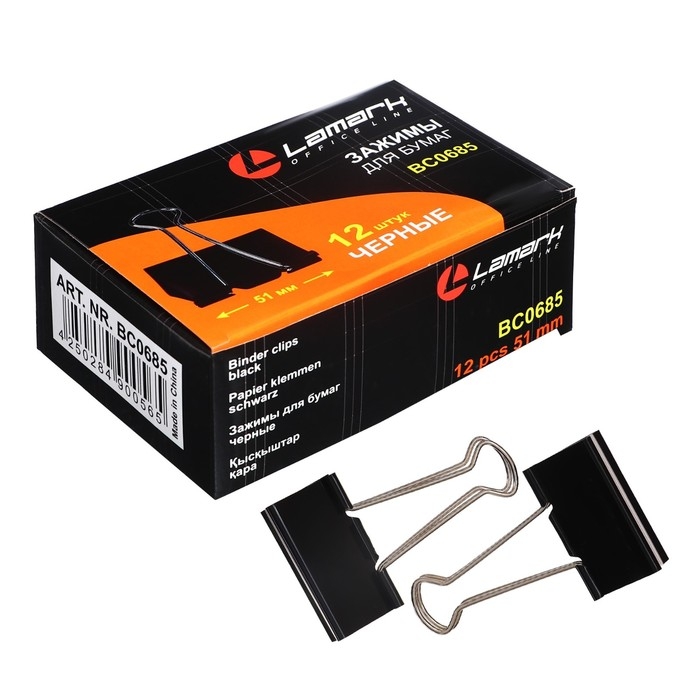 Зажимы для бумаг черные. Размер 51 мм. 12 штук в цветной картонной коробке.