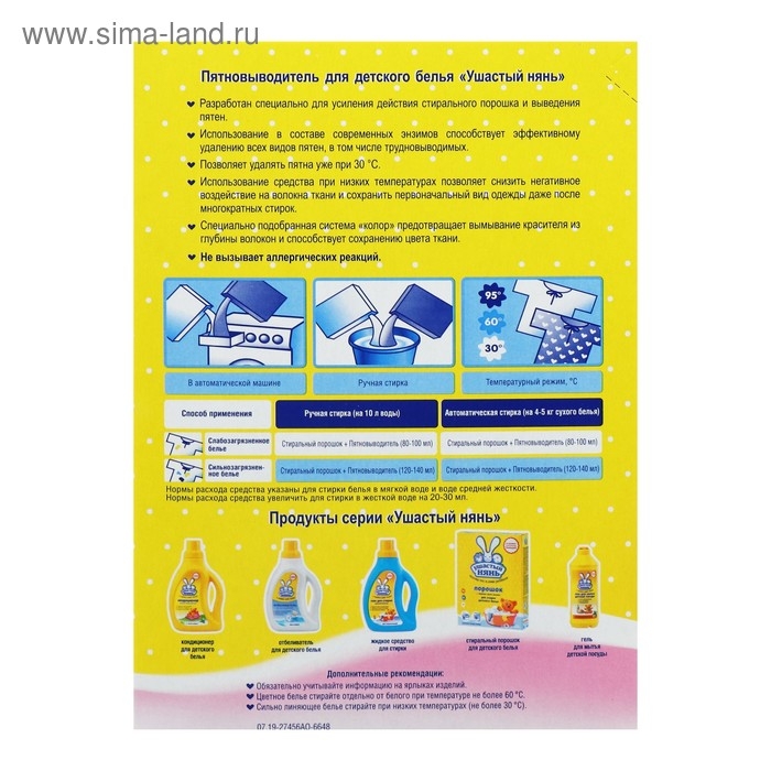 Пятновыводитель «Ушастый нянь» усиливает действие стирального порошка при выведении загрязнений с детских изделий. Средство подходит для обработки вещей новорождённых.