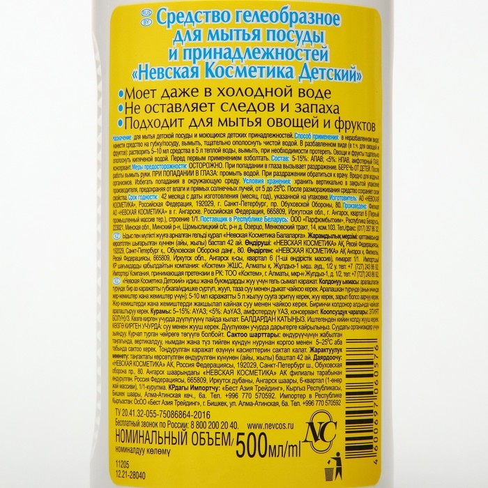 Средство для мытья посуды и принадлежностей "Невская Косметика Детский", 500 мл