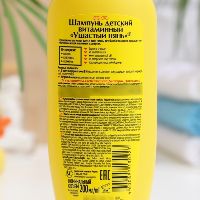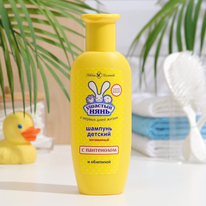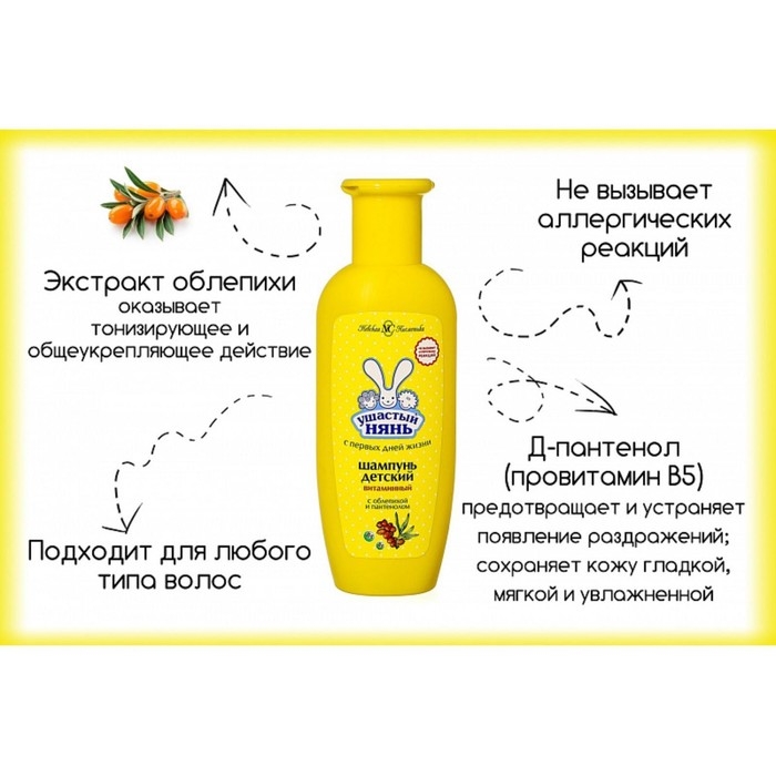 Ушастый нянь Шампунь детский Витаминный с облепихой и пантенолом специально разработан для ухода за детскими волосами с первых дней. Шампунь подходит для детей любого возраста, а также для взрослых с чувствительной кожей. Шампунь обеспечивает бережный уход, не щиплет глазки, не вызывает слёз, не сушит и не раздражает нежную кожу. Шампунь прозрачного цвета, обладает приятным нежным ароматом. Детский шампунь имеет естественный PH баланс, возвращает волосам блеск. Д-пантенол в составе шампуня увлажняет, заживляет кожу, защищает волосы от повреждений. Облепиха увлажняет и питает волосы и кожу. Благодаря детскому шампуню Ушастый нянь, водные процедуры принесут малышу радость. В результате применения детского шампуня, кожа и волосы малыша чистые и увлажненные без сухости и раздражения. В составе детского шампуня Ушастый нянь нет красителей, силиконов, щелочи. Шампунь подходит для частого применения.