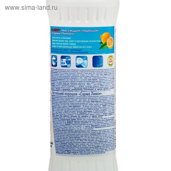 Чистящий порошок Sarma «Отбеливание» прекрасно очищает посуду от налёта, жира и пригоревших остатков пищи и при этом не содержит хлора.