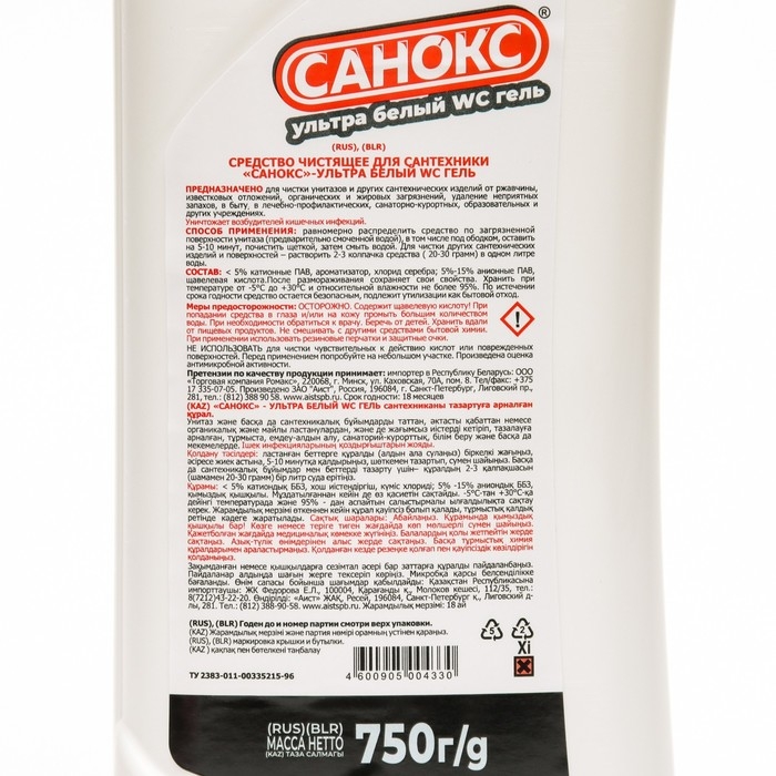 Гель для сантехники "Санокс" ультра-белый, 750 мл