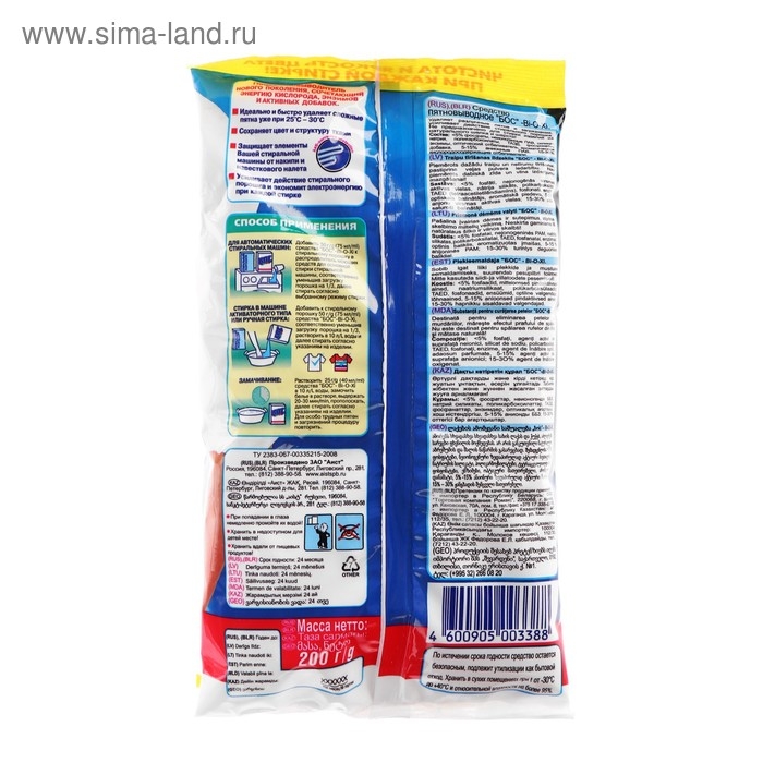 Пятновыводитель «БОС Bi-O-Xi» быстро удаляет сложные загрязнения от кофе, какао, чая, молока, крови, травы, фруктов, соуса, пота, масла при температуре от 25 °С. Сочетает в себе энзимы и активные добавки, которые обеспечивают чистоту и яркость вещам.