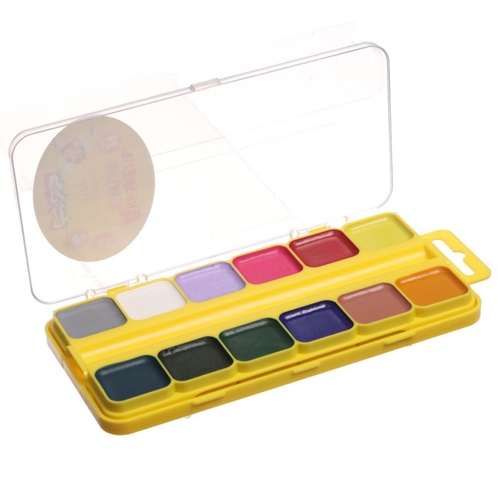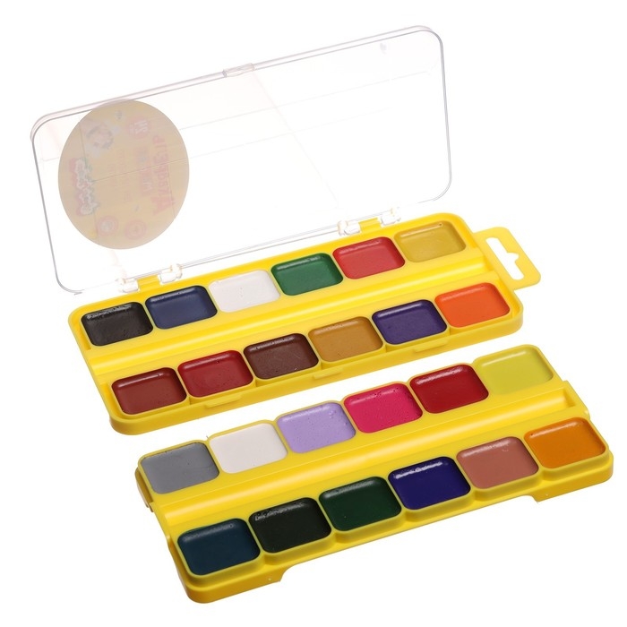 Акварель безопасна для детей. Удобный пластиковый пенал, крышка плотно фиксируется и служит палитрой для смешивания красок.