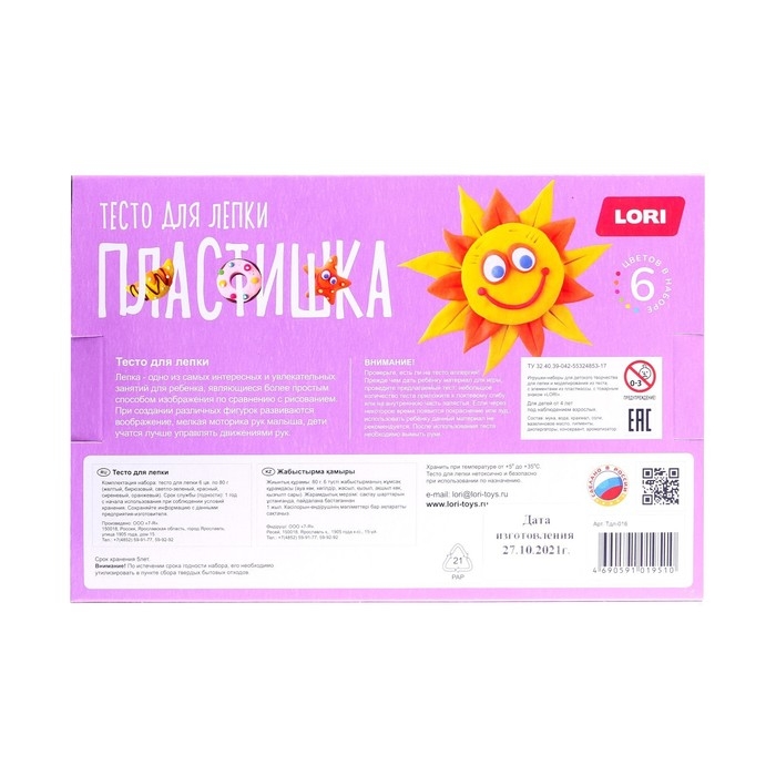 Тесто для лепки «Пластишка № 2», 6 цветов по 80 г