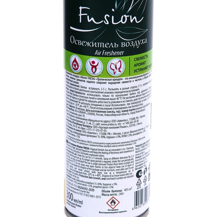 Освежитель воздуха с ароматом Тропическая орхидея – это инновационная формула 3 в 1. Коллекция легких нежных ароматов надолго сохранит ощущение свежести и чистоты в Вашем доме, устранив неприятные запахи. Способ применения: баллон встряхнуть 2-5 сек. Распылять в разные стороны 2-3 сек, направив струю вверх. При необходимости более длительного распыления упаковку периодически встряхивать.Меры предосторожности: баллон под давлением, не распылять вблизи открытого огня и раскаленных предметов! Предохранять от воздействия прямых солнечных лучей и нагревания свыше 40 С. Не разбирать баллон и не давать детям. Не курить во время применения! Не допускать попадания в глаза! Не вскрывать и не сжигать баллон, даже после полного его использования! Применять при температуре не ниже + 10 С. Хранить при температуре от – 20 до + 40 С. Срок годности 36 месяцев с даты изготовления.Состав: вода, углеводородный пропеллент 15-30%, отдушка 5%, нпав 5%, консерваны 5%, пропиленгликоль 5%.