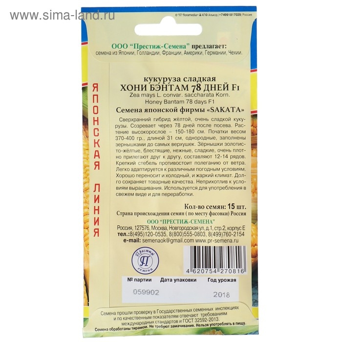 Семена Кукуруза сладкая "Хони Бэнтам 78 дней", F1, 15 шт.