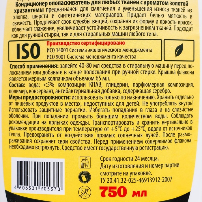 Кондиционер-ополаскиватель для любых тканей Fedora "Золотая хризантема" антибактериальный, объёмом 750 мл - это незаменимое средство для ухода за вашими вещами. Он обеспечивает мягкость и свежесть белья, облегчает глажку и помогает сохранить форму одежды. Благодаря своему уникальному составу, кондиционер предотвращает появление неприятного запаха и размножение бактерий, делая ваши вещи безопасными для здоровья. Аромат "Золотая хризантема" подарит вашему белью неповторимый шарм и очарование, наполнив дом атмосферой уюта и комфорта.