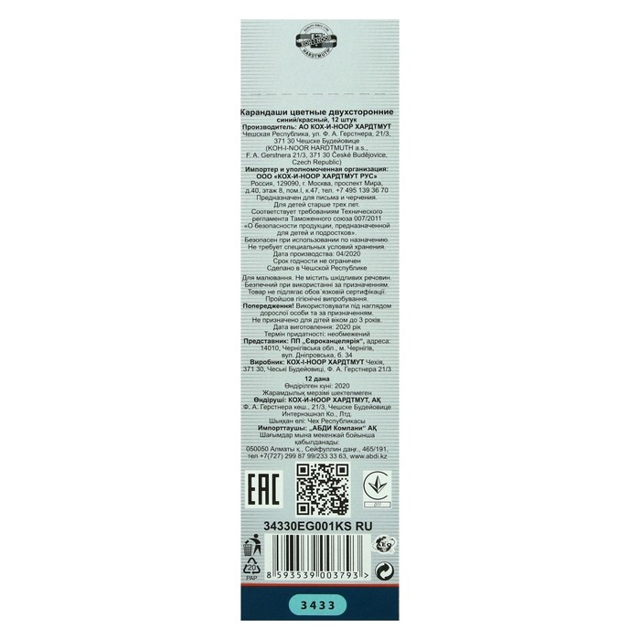 Карандаш двухцветный Koh-I-Noor 3433, сине-красный
