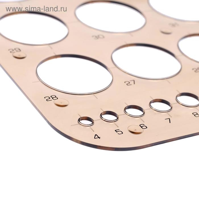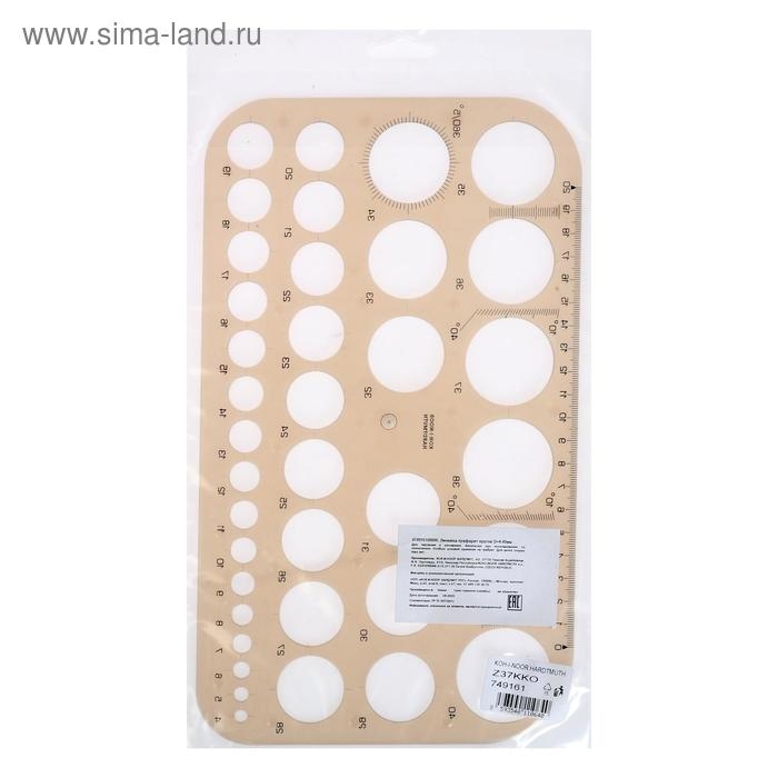 Шаблон круга изготовлен из дымчатого прозрачного полистирола. Предназначен для рисования кругов диаметром 4-40 мм с шагом 1 мм с помощью заточенного карандаша, механического карандаша, технических ручек. Все круглые отверстия обозначены напечатанным номером, представляющим диаметр и поперечное сечение оси. Кроме того, на шаблоне печатается следующее: шкала длины 200 мм, шкала транспортира 0-360° (с шагом 5°), две шкалы транспортира 0-40° (с шагом 1°) и шкала для параллельных линий. Отпечатки выполнены с использованием точной технологии трафаретной печати и устойчивы к износу при обычном использовании. Шаблон предназначен для рисования и технического черчения в школах и офисах.
