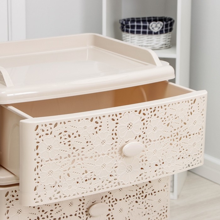 С помощью практичного пластикового комода вы правильно организуете хранение вещей. Изделие имеет жёсткую конструкцию за счёт цельных боковых стенок. Отсутствие острых углов делает его безопасным для ребёнка. Комод изготовлен из экологически чистого материала, не содержит вредных веществ.
