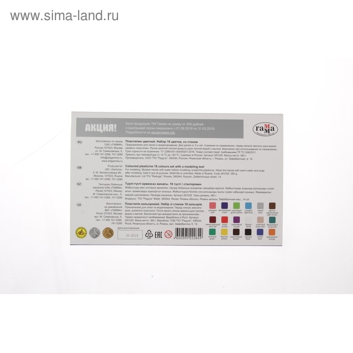 Пластилин 18 цветов 360 г, "Гамма" "Классический", со стеком